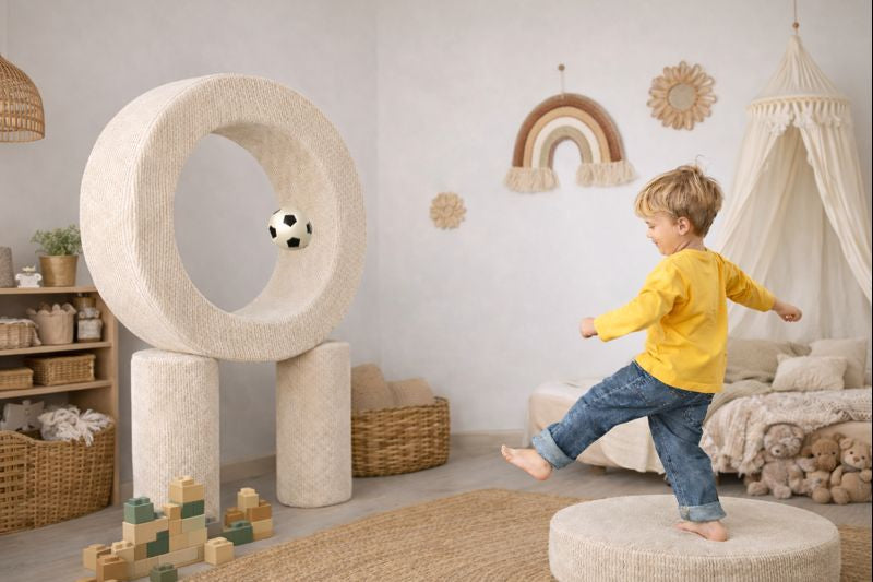 Der ringförmige Pouf ist sofort intuitiv verständlich. Kinder krabbeln hindurch, machen es sich darin gemütlich, bewegen ihn und erfinden ihre eigenen Spiele. Diese Freiheit fördert Selbstständigkeit, Fantasie und bildschirmfreie Aktivitäten – ganz im Sinne der Montessori-Pädagogik.