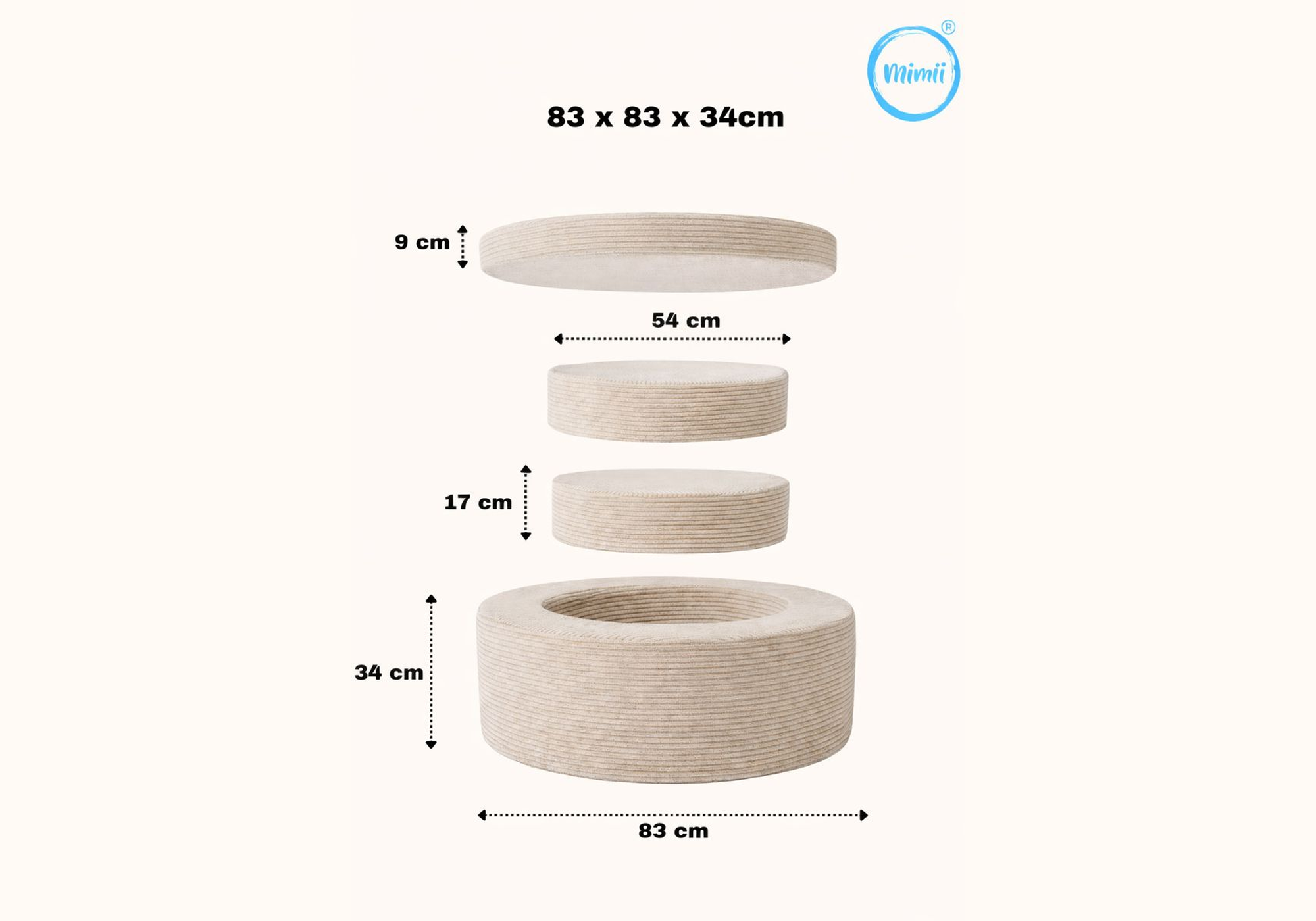 Mit den Maßen ca. 83 × 83 × 34 cm passt sich dieser runde Kinderhocker den Bedürfnissen Ihres Kindes in jeder Wachstumsphase an. Er kann als aktive Spielfläche, zur Förderung des Gleichgewichts oder als ruhige Leseecke dienen. Ein vielseitiges und langlebiges Möbelstück.
